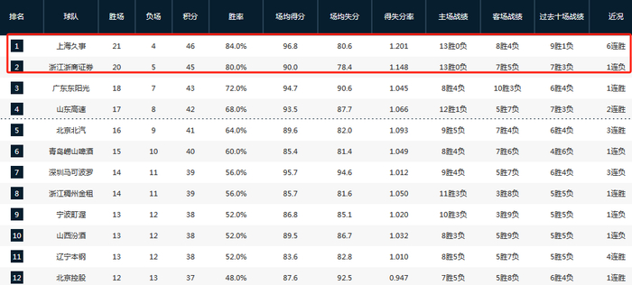 CBA常规赛,上海男篮129-79击败四川男篮。一波6连胜之后,总战绩来到了21胜4负稳居积分榜第一,与第二的广厦相比,已经拉开了2个胜负差。