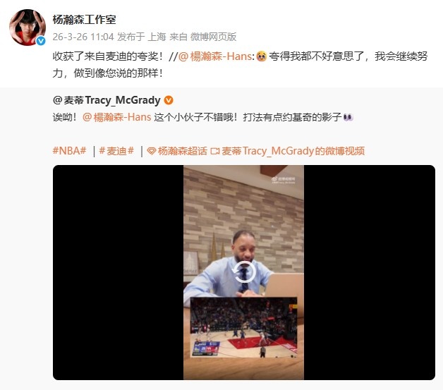 此前,NBA名宿麦迪称“杨瀚森打法让他想到约基奇”,杨瀚森对此评论道:“🥹夸得我都不好意思了,我会继续努力,做到像您说的那样!”